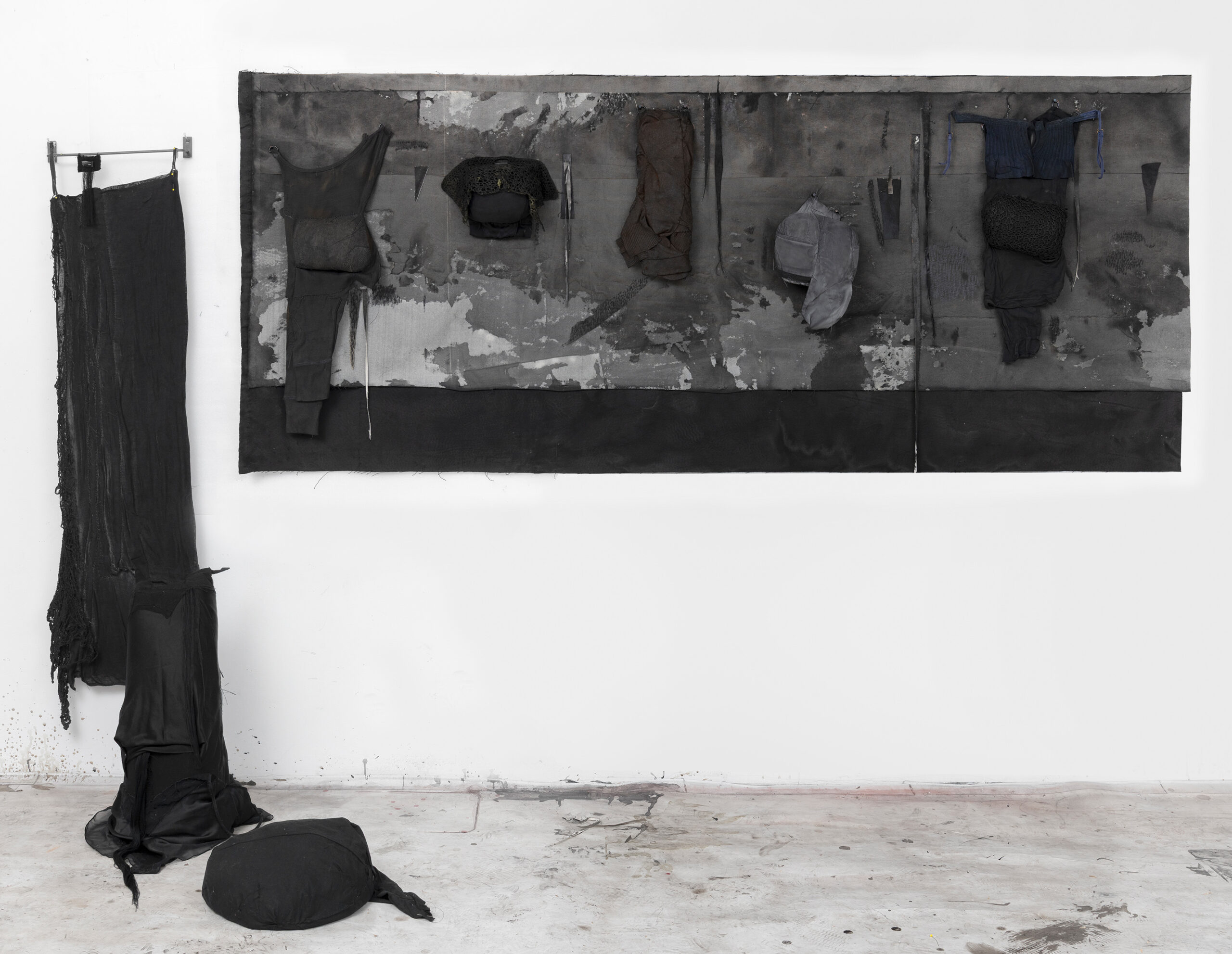 som skaper maleriske avleiringer, deretter starter tildekningen med kull, pastellkritt eller tekstiler.